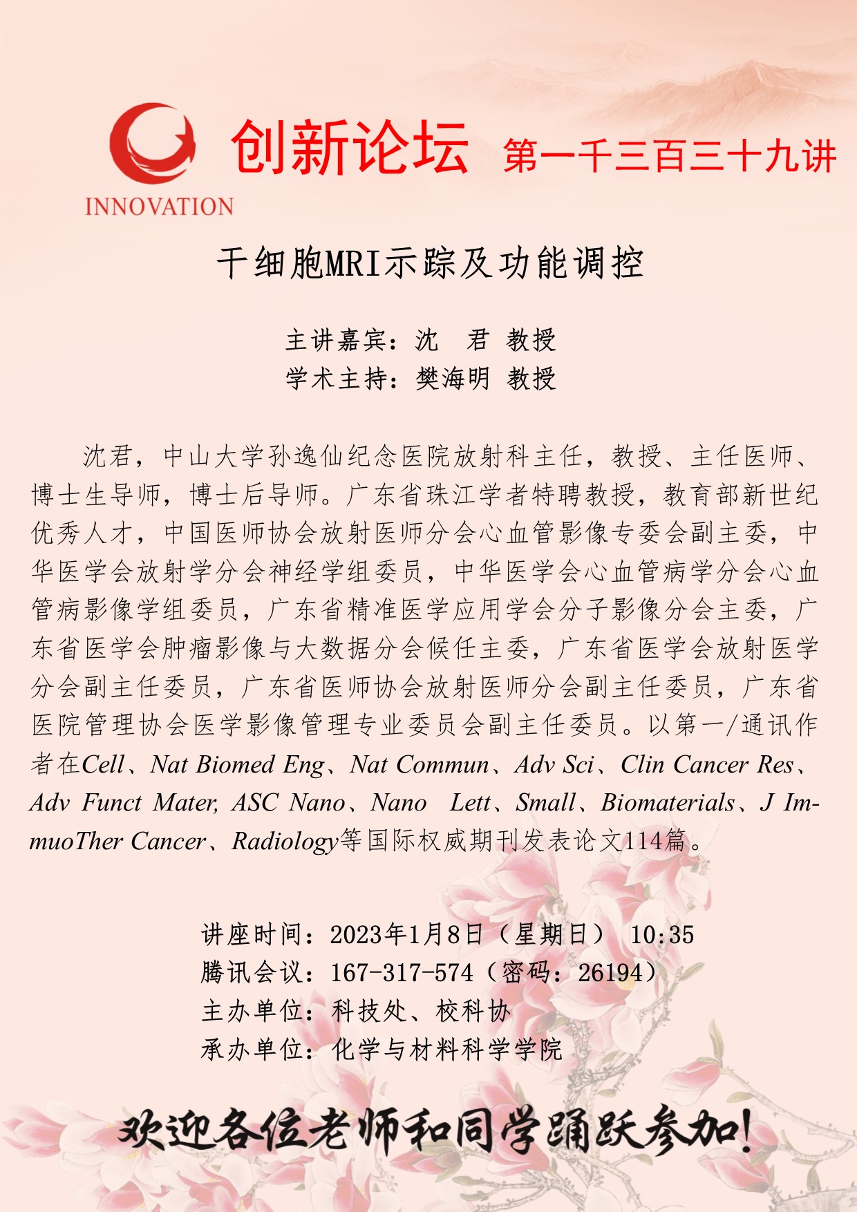 我校创新论坛第一千三百三十九讲:干细胞MRI示踪及功能调控